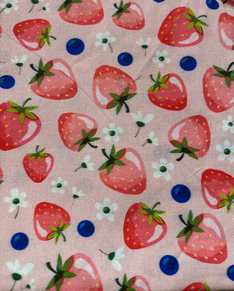 Stoffa fragole e mirtilli fondo rosa